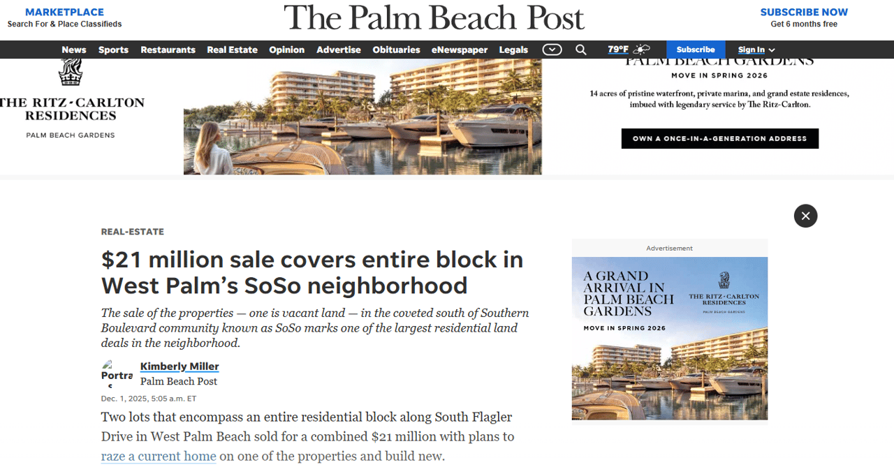 “$21 million sale covers entire block in West Palm’s SoSo neighborhood”