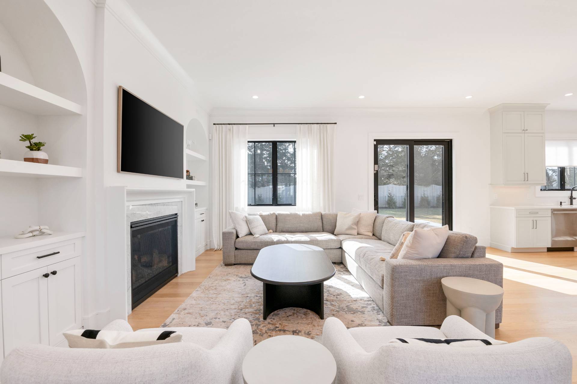 Experience the perfect blend of luxury and functionality in this brand new, professionally designed residence. The home features six bedrooms and five and a half bathrooms, including a spacious primary suite on the main level. Furnished exquisitely, the home can accommodate up to 17 guests, and offers well-appointed sleeping arrangements with 5 twin beds, 4 queen beds, and 2 king beds. A covered porch welcomes you into a striking double-height entryway, leading to an expansive great room filled with natural light. Designed for both comfort and style, the great room showcases a fireplace and sliding glass doors that open seamlessly to a beautifully designed patio and pool area. The backyard faces south providing for all day sun so you can enjoy your pool any time of the day. The chef's kitchen is outfitted with top-tier Wolf, Sub-Zero, and Bosch appliances, catering to both casual dining and elegant entertaining. Rich white oak flooring extends throughout the home, adding warmth and sophistication to the interiors. The meticulously landscaped grounds are equipped with an inground irrigation system and offer a private outdoor oasis, complete with a large blue stone patio and pristine pool-ideal for relaxation and entertaining. This prime location is just one mile from Main Street's vibrant shopping and dining scene, while Rogers Beach is a little over two miles away, providing easy access to the coastline. Situated approximately 90 minutes from Manhattan, this home offers the perfect balance of tranquility and convenience in the sought-after Westhampton Beach community.